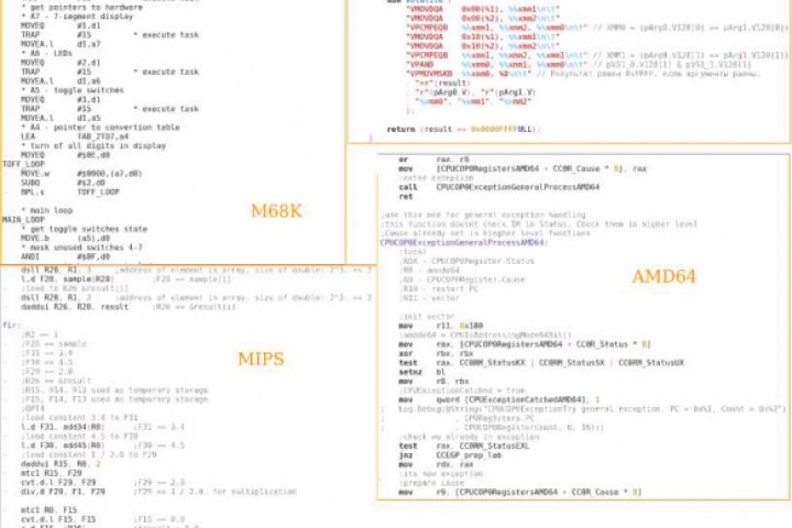 Кодирование на ассемблере для разных платформ: IA-32+AMD64 (SSE2, AVX), MIPS, m68k, AVR, STM32 (ARM Thumb-2).
