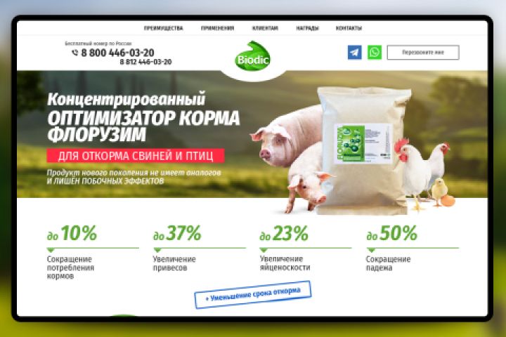 Одностраничный сайт производителя Концентрированного оптимизатора корма “Флорузим”, компании “Биодик”.