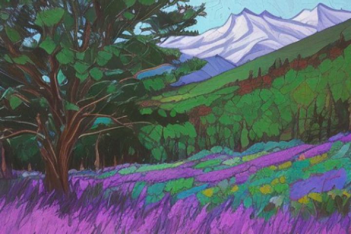 Дерево на фоне гор. В стиле Эрин Хэнсон