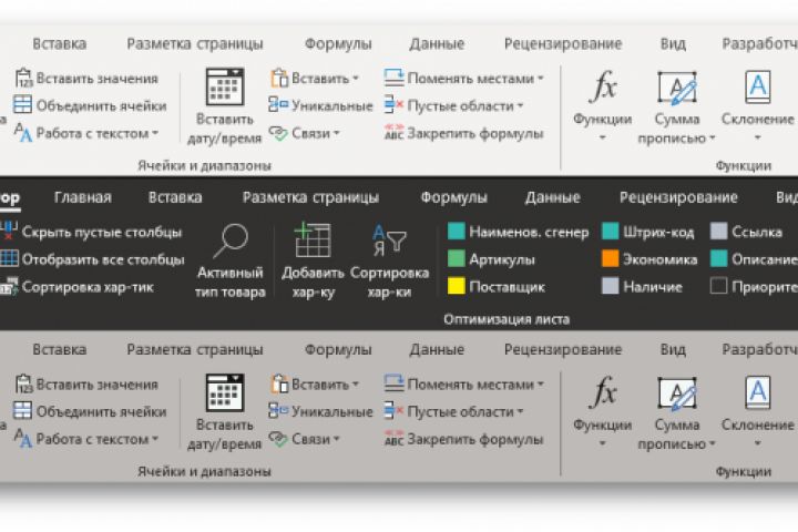 Функционал, который мы разрабатываем в Excel размещаем на ленте меню. Тем самым превращая ваш файл в мощный современный инструмент работы с данными.