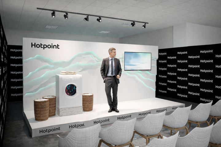 Клиент поставил задачу создать современную 3D-визуализацию выставочного стенда для презентации бытовой техники бренда Hotpoint. Важно было уйти от ощущения «обычного торгового стенда» и сформировать премиальный, технологичный образ бренда, который вызывает доверие и эмоциональный отклик.