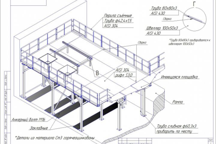 Площадка 8500х3400х5200 для обслуживания оборудования, общий вес конструкции 7 тонн, выполнена из прокатного и листового металла, нержавейки и горячеоцинкованного чёрного металла, данная площадка стыкуется с уже имеющейся.