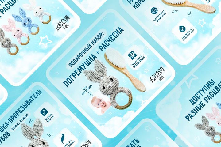 Для стилистики взял за основу голубой цвет из гайдлайна бренда. Сам дизайн старался сделать с ощущением легкости для ассоциации с детской тематикой.
