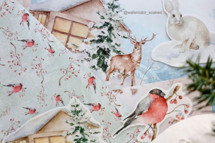 Создание набора акварельных иллюстраций на тему зимнего леса для изготовления специализированной бумаги (скрапбукинг).