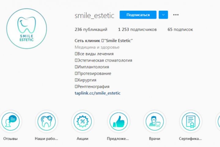 Оформление страницы стоматологической клиники в Instagram "Smile estetic"