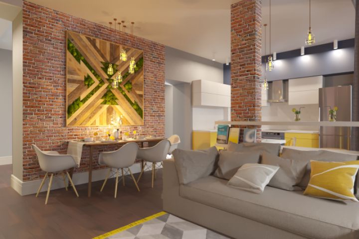 Кухня выполнена в ярких,солнечных цветах. Дополнена барной стойкой и небольшим столом для быстрого перекуса. Для остальных приемов пищи, а также для приема гостей в гостиной предусмотрен обеденный стол.