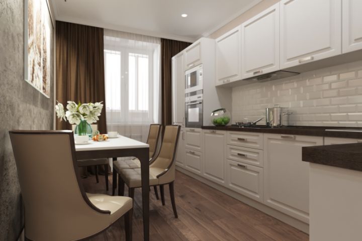 Кухня-столовая со столом для четырех человек, зона принятия пищи декорирована рельефной штукатуркой и картинами с подсветкой.