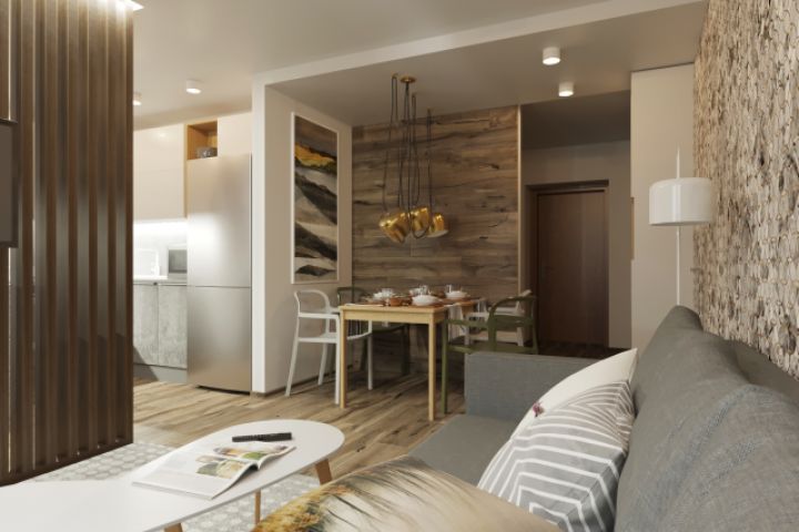 Кухня отделена от гостиной перегородкой из реек, подсвеченных сверху светодиодной лентой. Зона принятия пищи выделена ламинатом (на стене) и светильником со свисающими проводами. На кухне имеется барная стойка для быстрого принятия пищи и подвесные шкафы, которые продолжают линию кухни.