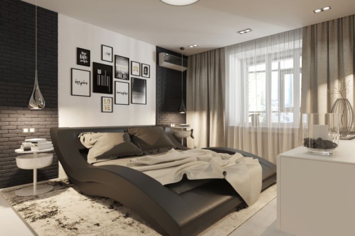 Спальня со встроенным шкафом для одежды, подвесным столом-консолью для работе на ноутбуке. В качестве декора- гипсовый кирпич, выкрашенный в черный цвет.