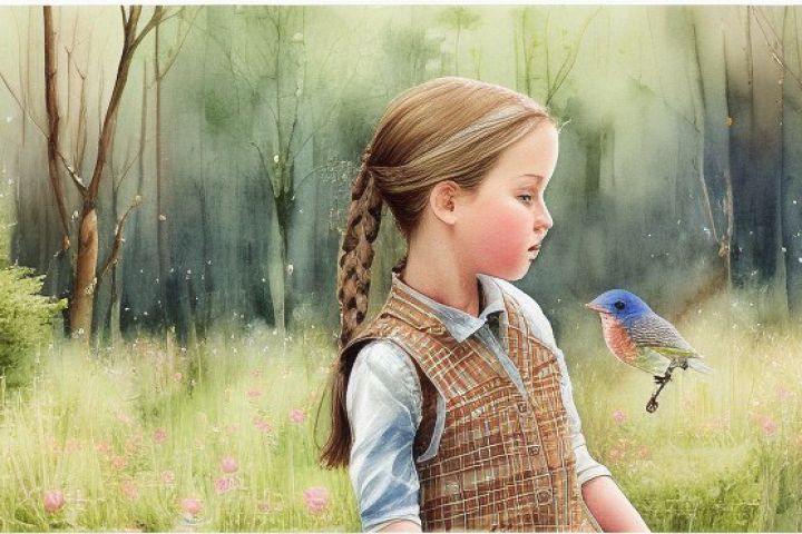 Иллюстрация создана с помощью нейросети Stable Diffusion по запросу: "девочка с косой в клетчатом платье и коричневыми волосами и птица в лесу". Стиль акварельная живопись. Доработано в Фотошопе.