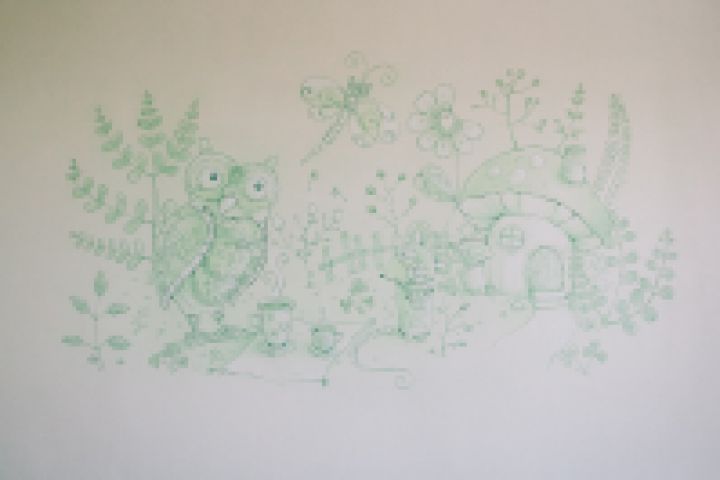 Роспись стен в классах детского центра "Развитие". Класс для занятий с самыми маленькими. Аэрограф, кистевая роспись. Акрил. Размер 4,5 кв.м.