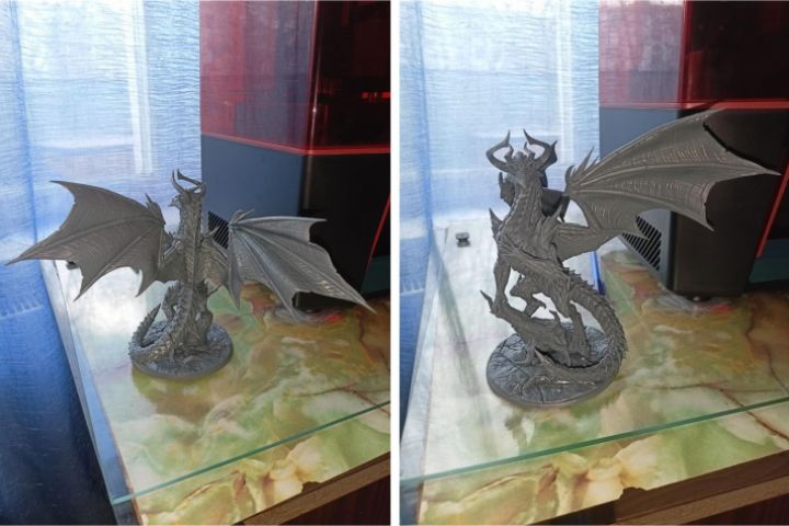 Дракон напечатан из нескольких частей. Затем каждая часть склеивалась смолой. Технология печати - LCD. Толщина слоя - 30 мкм.