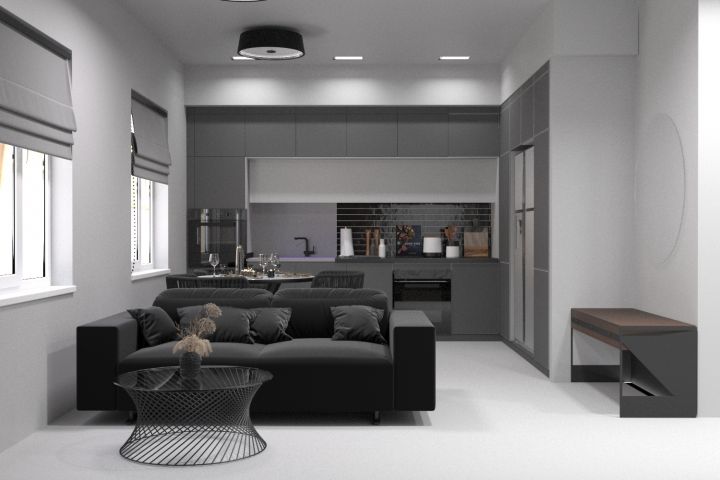 3ds Max + Corona render, гостинная с объединенной кухней.