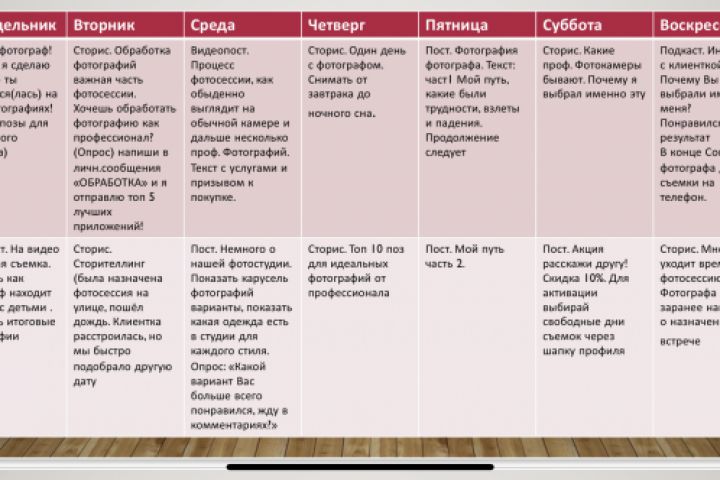Контент- план на 2 недели для фотографа