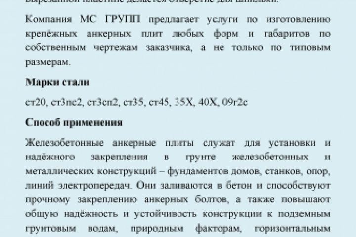 Описание для компании металлопроката МС-ГРУПП (анкерная плита)