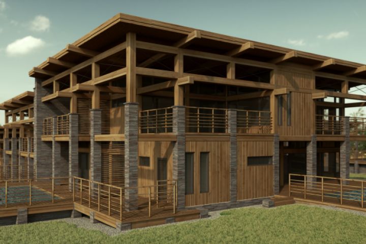 Элитный туристический комплекс в Подмосковье включает в себя гостевые блокированные дома фахверкового типа для временного проживания.