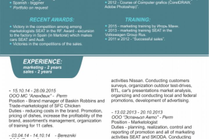 Макет собственной разработки, текст резюме на английском языке