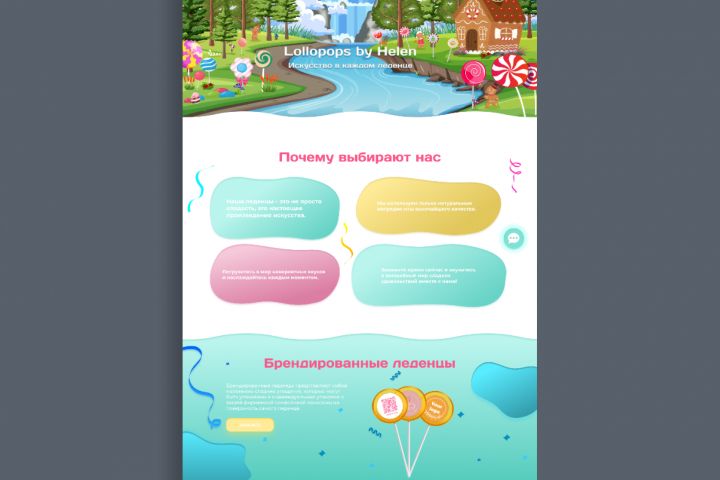 Предпочтения в цветах нет. Но хотелось бы что-то яркое, вдохновляющее, сказочное и в то же время нежное. Потому, что важно подбирать цвета под фотографии. Да, что-то интересное. Сайт должен вдохновлять. Мы продаём необычные леденцы. Это не чупачупсы, и сайт должен подчёркивать уникальность продукта.