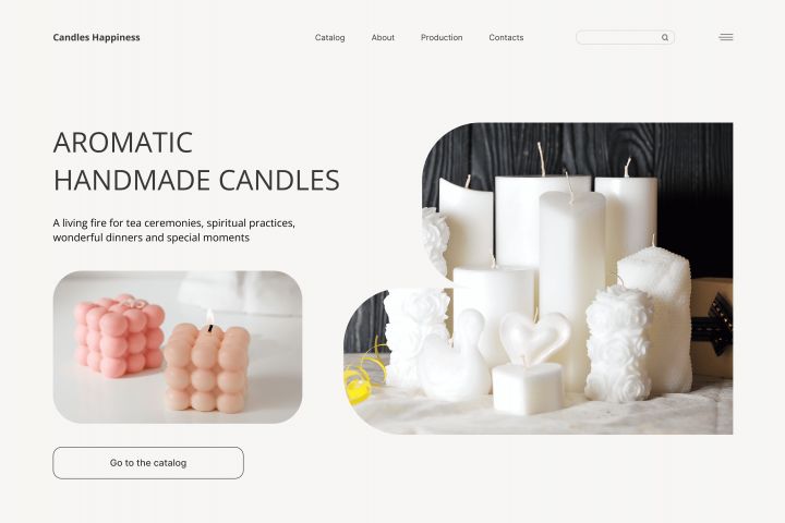 Дизайн для сайта продажи свечей ручной работы. Акцент был сделан на фотографии, цену и оформление сайта. чтобы он был лёгким и приятным.