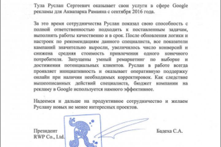 Тула Руслан Сергеевич оказывает свои услуги в сфере Google рекламы для Аквапарка Рамаяна с сентября 2016 года.