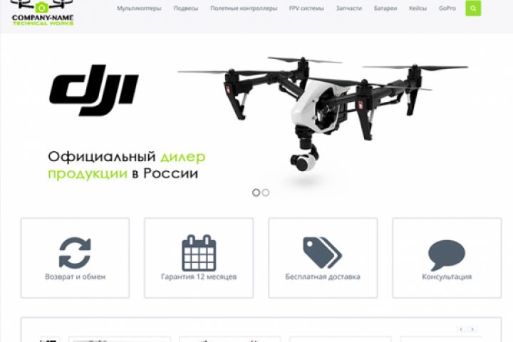 На сайте представлен каталог дронов с возможностью онлайн-покупки и фильтрацией по параметрам.
