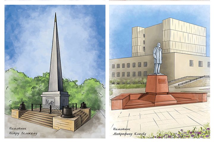 Иллюстрации для подарочных открыток с достопримечательностями города Липецка.