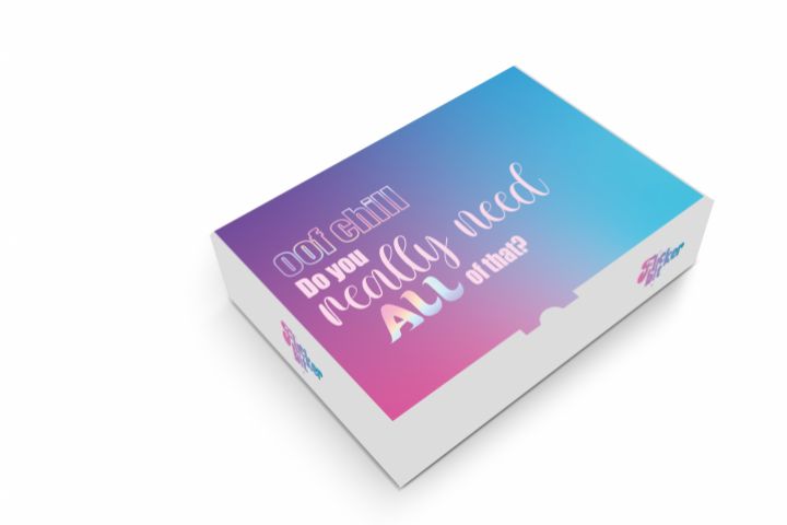 Одна из пяти авторских коробок мерч-бренда "FlickerBit" . Веселые надписи для поднятия настроения снаружи и приятными пожеланиями внутри. Верх коробки исполнен в фирменных цветах бренда с элементами голографической бумаги. Внутри коробки авторский принт.
