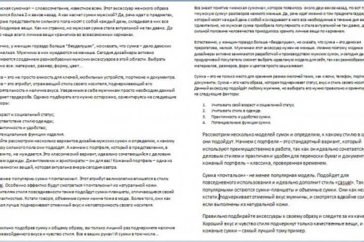 Рерайт текста о мужских сумках. Слева - предоставленный текст, справа - рерайт со 100% уникальностью по текст.ру