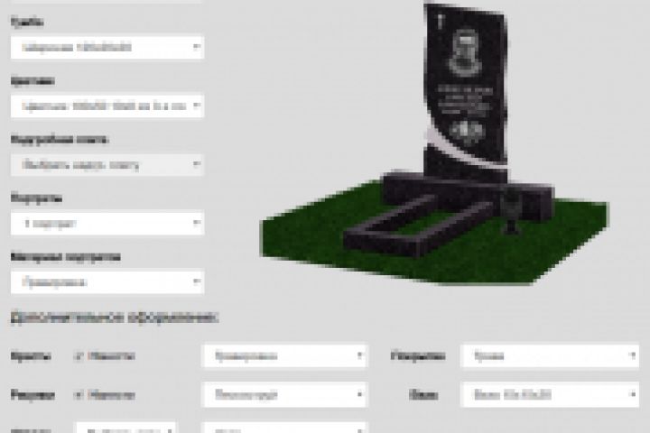 Разработка конфигуратора (калькулятора) для расчета стоимости памятников и надгробных плит. Пользователь может отправить свой заказ менеджеру, распечатать или сохранить в виде изображения.