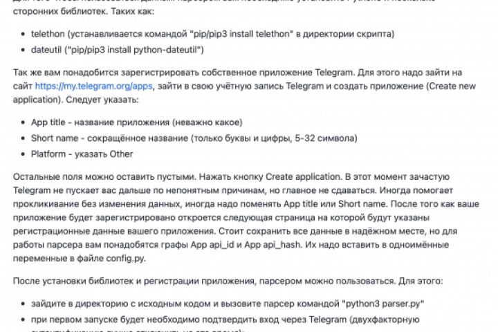 Парсер собирает сообщения из телеграм каналов/чатов и раскладывает их по папкам [id канала]/[id сообщения]/сообщение, ./метаданные, ./медиа