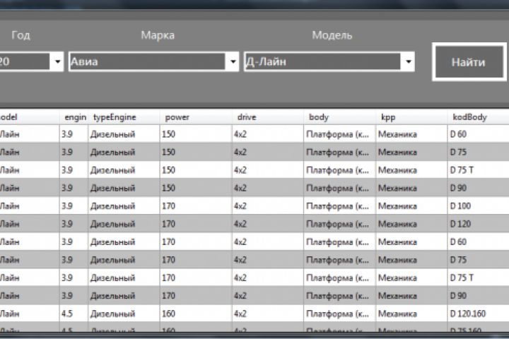 Прога под Windows. Предоставляет коды кузова и ДВС с сайта по АПИ в Excel для зависимого фильтра - по году - по марке - по модели для всех объмов и мощностей двигателя - типов ДВС - приводов - кузовов - КПП