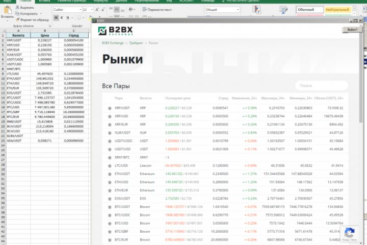 Прога на C# - парсинг в реальном времени пар в Excel. Сайт работает по WebSockets - поэтому на сайт нагрузка не создается никакая. Данные по парам берутся из браузера - CefSharp.WinForms.