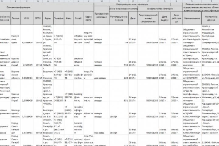 Классифицированные объекты: Гостиницы и иные средства размещения Консольное приложение под Windows. Парсит в Excel. Около 8500 записей. Поля как на картинке.