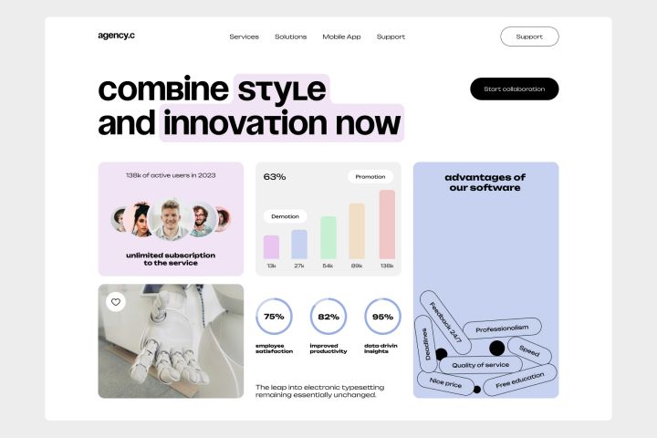 Весь дизайн построен так, чтобы агентство выглядело стильным, уверенным, технологичным и клиентоориентированным.