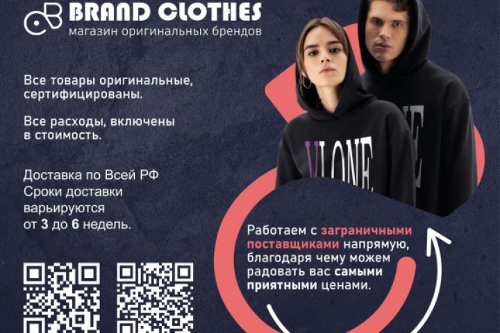 Онлайн баннер для компании "Brand clothes". Сейчас компания уже не работает, это был временный проект во время роста цен на зарубежные бренды в РФ (информация для тех, кто из любопытства перейдёт по qr коду). Логотип, фирменные цвета и стиль - собственная разработка с нуля