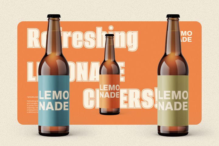 Крупная живая типографика «Refreshing Lemonade Cheers!» создаёт энергию, движение и легко считывается. Текст перекликается с формой бутылки, создавая цельный композиционный ритм.