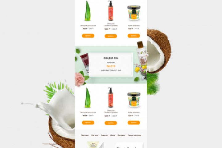 - создала воздушную композицию с использованием кокоса, зелени и природных элементов, чтобы подчеркнуть натуральность продуктов;