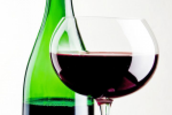 Бокал красного вина и зеленая бутылка на белом фоне