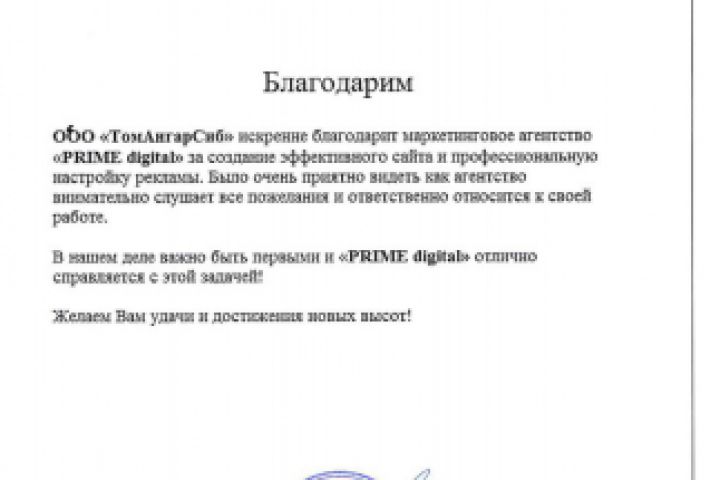 Благодарность от строительной компании "ТомАнгарСиб"