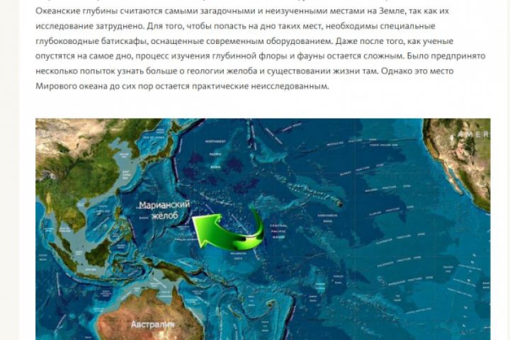 Информационная статья о том, что Марианский желоб - самая глубокая точка планеты.