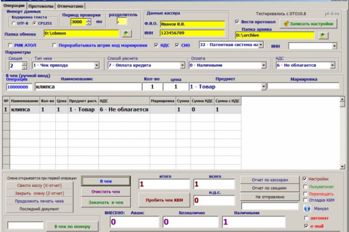 Программа для создания и отправки задания на печать чека кассами АТОЛ (atol 30ф и т.п.). Ввод данных возможен непосредственно в интерфейсе программы, также путем автоматической обработки текстового файла обмена данными с торговым ПО (например с ПО выполненным в MS Access), также путем подключения к РМК Атол (старая программа).