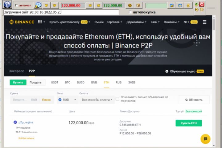 Автоматизация p2p торговли криптовалютой на площадке p2p.binance.com. Ведется автоматический контроль разницы между ценами продажи и покупки с ограничением по порогу срабатывания.