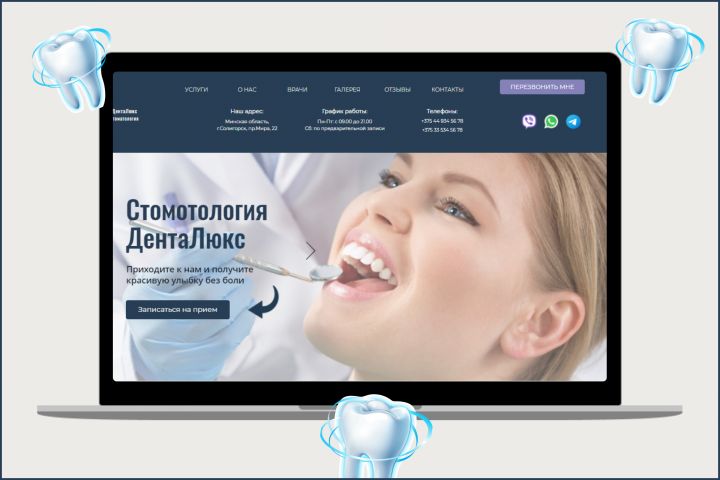 Сайт под ключ для частной стоматологии. Основные блоки - услуги, о клинике, преимущества, кабинеты и оборудование (фотогалерея), специалисты, галерея работ, отзывы, контакты, сопутствующие товары (элементы интернет-магазина). Анимация. Адаптивная верстка. Индивидуальный дизайн. Формы захвата и кнопки соц.сетей.