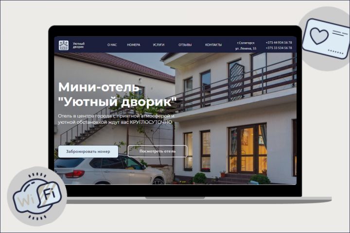 Разработка сайта "под ключ" для мини-отеля. Индивидуальный дизайн, адаптивная верстка. Добавлены элементы интернет-магазина для заказа дополнительных услуг, с подключением корзины и оплаты. Квиз-форма и формы обратной связи.