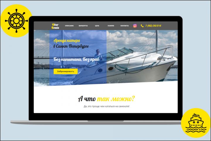 Лендинг для яхт-клуба по аренде катера "Я - капитан". Настройка форм обратной связи, адаптация под мобильные устройства, настройка карты, переход в мессенджер, активная кнопка звонка.