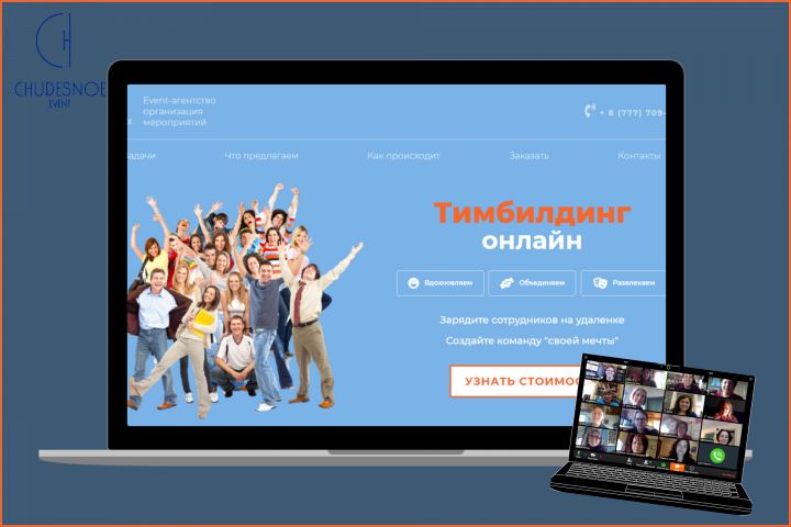 Лендинг для агентства, занимающегося проведением мероприятий различной направленности, в т.ч. онлайн-тимбилдинг для удаленных сотрудников. Формы обратной связи. Адаптивная верстка.