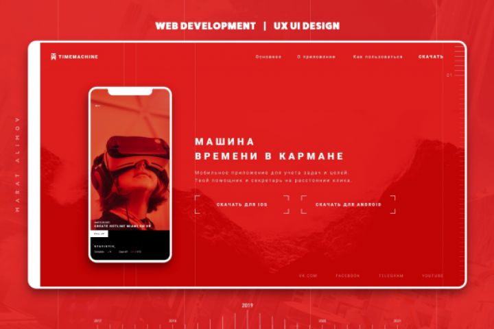 Дизайн лендинга, приглашающий скачать приложение TimeMachine - многофункциональный личный дневник с задачами от одного дня до года и более.