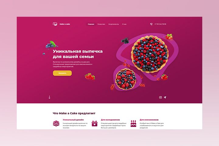 2. Клиент, заходя на сайт, видит первый экран с WOW эффектом, который сообщает клинту, что здесь торты уникальные и классические. Далее преимущество, чем Make a cake отличается от конкурентов. Ниже клиент может ознакомиться с ассортиментом, узнать историю становления Make a cake. Далее клиент ознакомившись с преимуществом и ассортиментом, может оформить заказ и вдобавок секция с акциями Make a cake, который должен усилить желание оформления заказа на этом сайте.