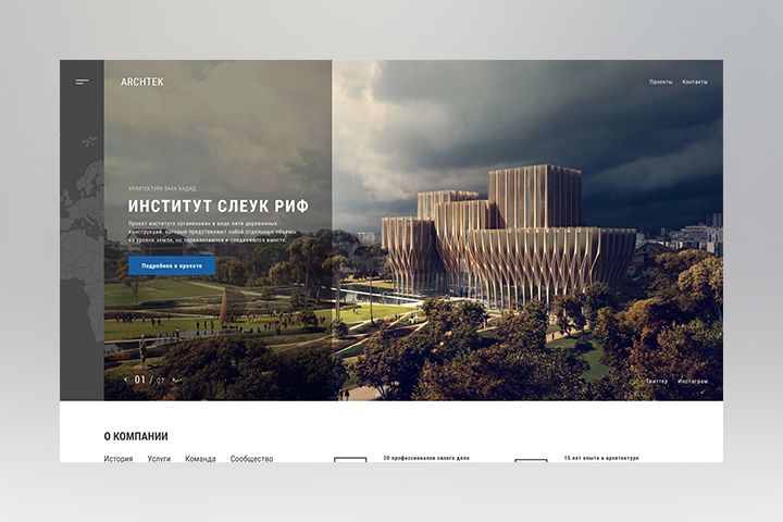1. Здесь пользователь на сайте, может ознакомиться с информацией о компании, отличительные характеры фирмы, проекты и контакты фирмы. Щелкнув на кнопку гамбургера (верхний левый угол первого экрана) можно найти больше информации о фирме (типы услуг, архитекторов фирмы, лицензия фирмы). Щелкнув на иконку карты (слева от первого экрана сайта, на других страницах съезжает в верхний левый угол) пользователь попадает на мировую карту, где отображены, в каких странах есть архитектурные объекты этой фирмы.