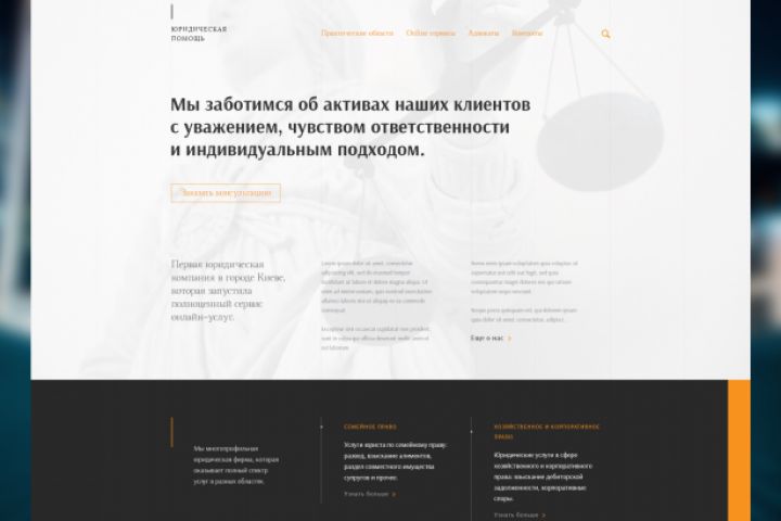 ЮРИДИЧЕСКАЯ ПОМОЩЬ – первая юридическая on-line компания. Дизайн сайта сдержанный и лаконичный, с упором на типографику.